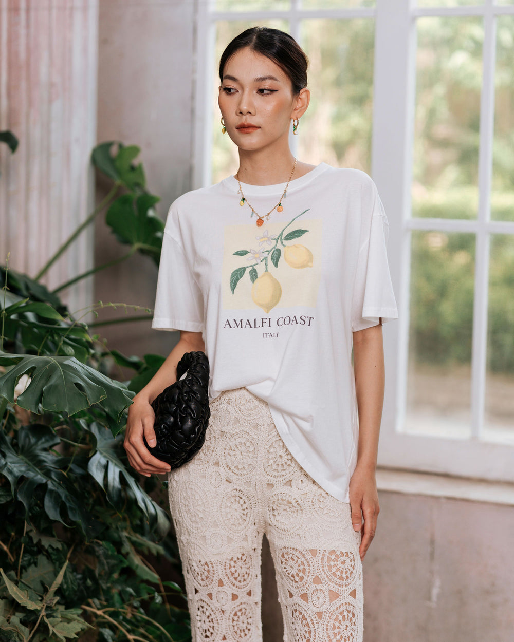 Crochet pants are the ultimate summer staple, combining breezy comfort with boho-chic vibes. Pair it with our most-favourited lemon t-shirts and charm necklace for a fun and playful look.